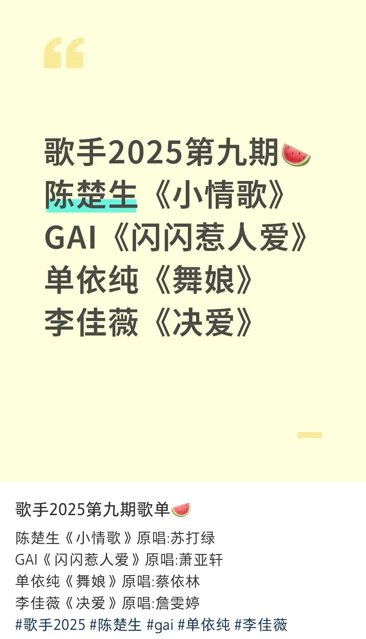 看到乔丹史密斯袭榜的消息,网友们开始关注,歌手们要唱什么歌曲,从网上传出的消息上看,陈楚生要演唱《小情歌》,GAI演唱《闪闪惹人爱》,单依纯演唱《舞娘》,李佳薇演唱《绝爱》。